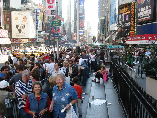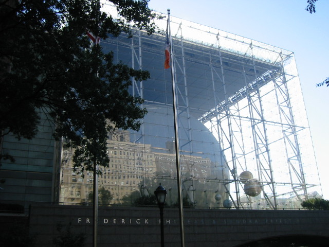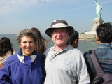 | The I.M. Pei-designed Rose Center for Earth & Space | Catherdral of St. John the Divine at dusk | Memorial to Merchant Seaman at Battery Park | On the ferry to Liberty Island and Ellis Island | Part of the line to buy cheap(er) seats -- Jackie and Nelda in foreground. | ||||||||||